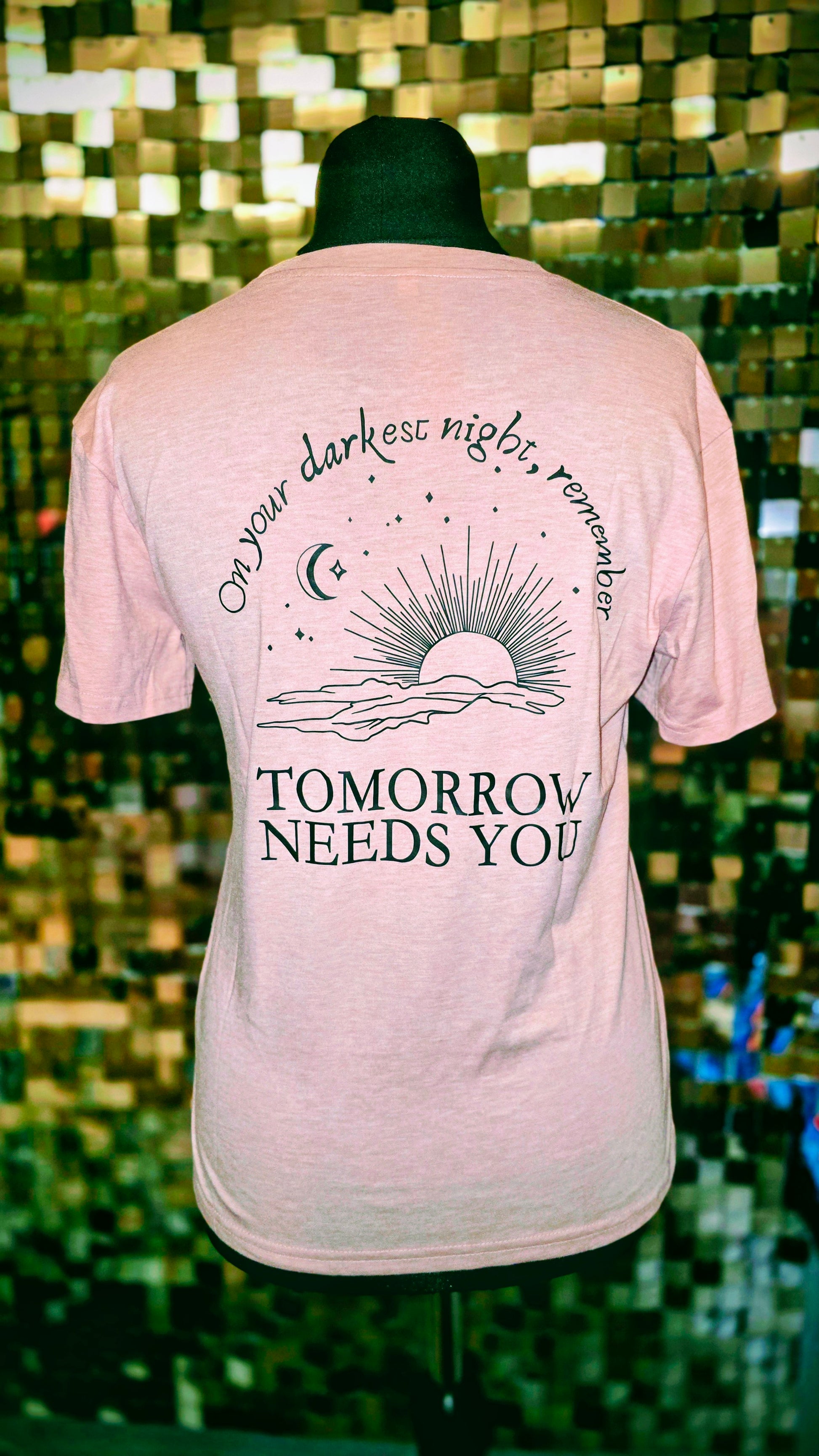 This soft pink tee hits with a bold heart print on the front – “You Matter” – and a celestial sunrise design on the back with the words: “On your darkest night, remember… TOMORROW NEEDS YOU.”